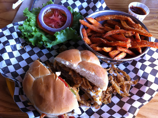 This was a great Western Burger w/ onion strings, monterrey jack cheese, and bbq sauce with a side of sweet potato fries! Mmmmm. Mom and I actually split this burger.